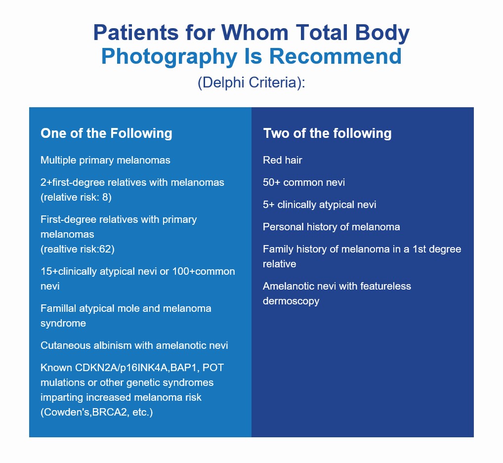 - Total body photography can be performed during a designated clinic visit.